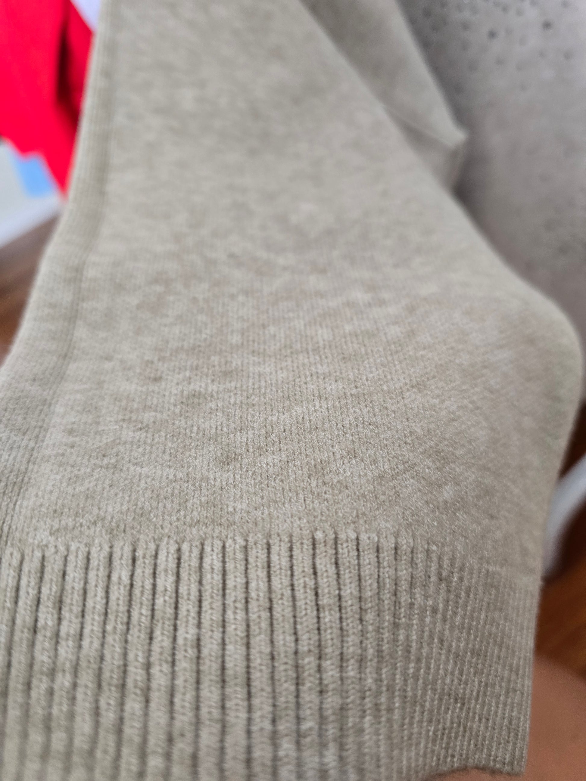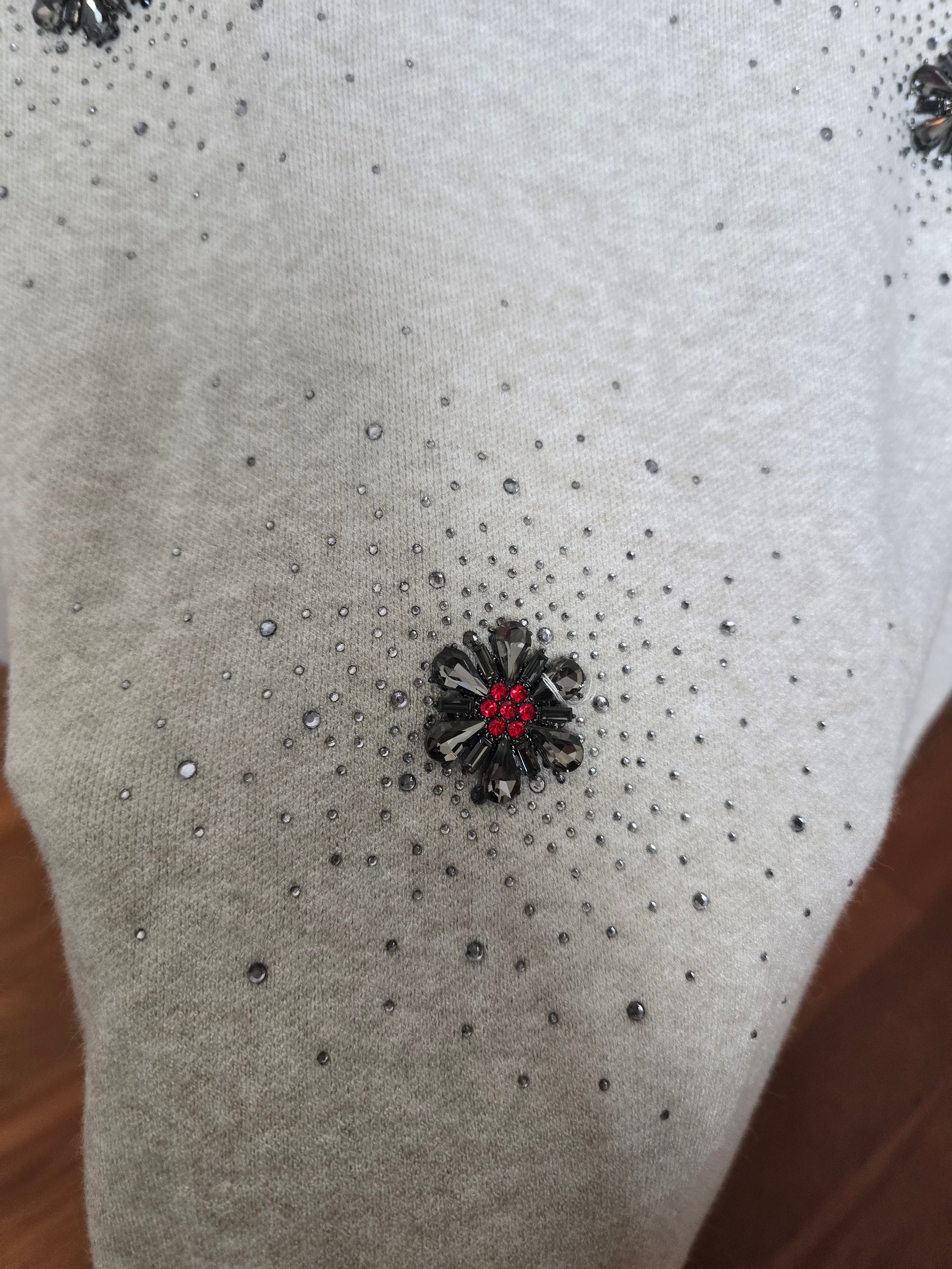 New seasonal collection. 3/4-length sleeves with ribbed trim and slim hem. Contemporary T-neck. Sleek and stylish. Embellished with red crystal jewelry. Relaxed and comfortable fit. Soft and luxurious fabric. Acrylic viscose and polyamide KM3022 from the UK.