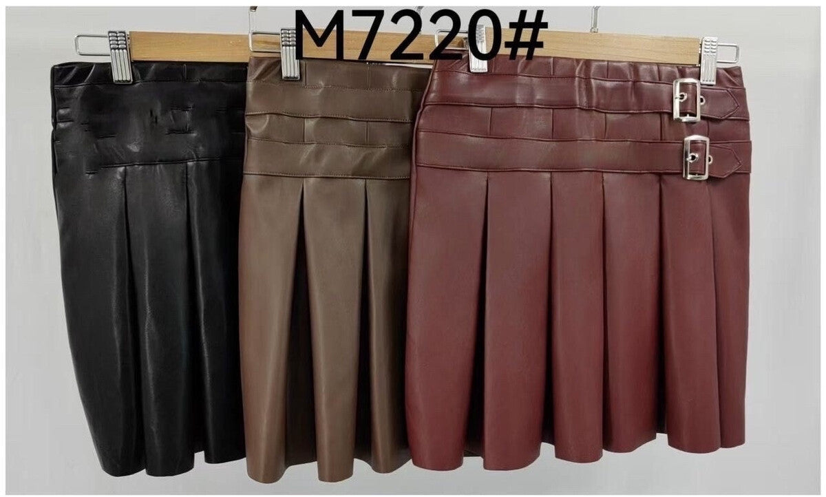 saia plissada de couro sintético com fivelas decorativas